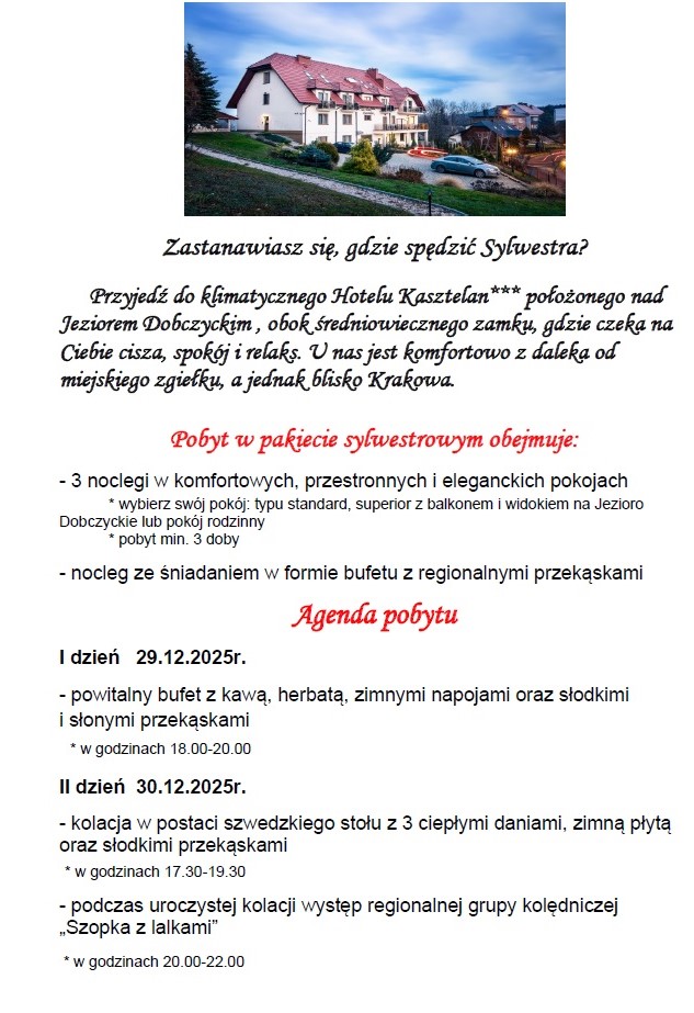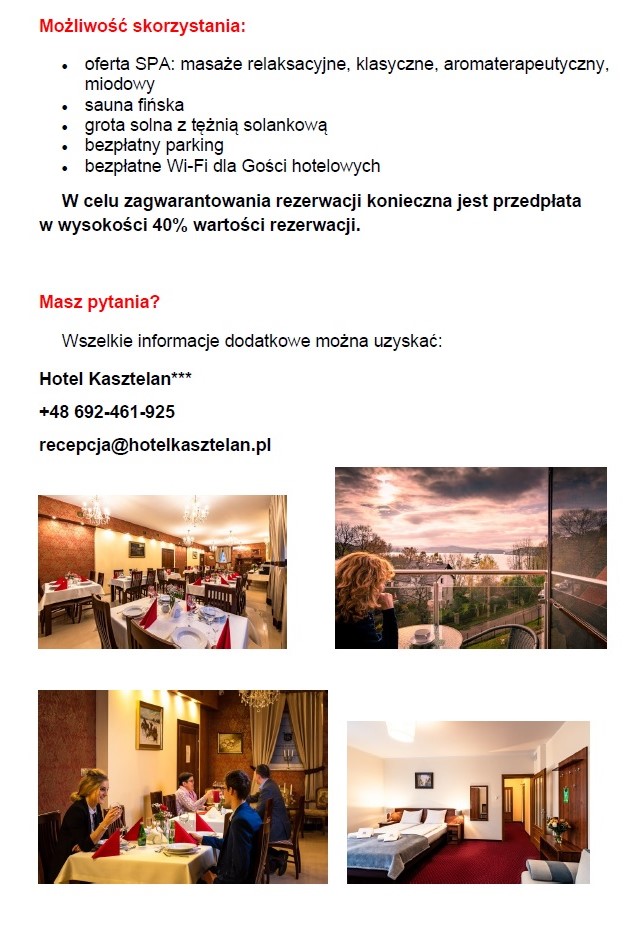 Zaprenumerowanie elektronicznych i bezpłatnych newsletterów należących do wymaga podania w odpowiednim formularzu swojego adresu e-mail. Uzyskane w ten sposób dane są dodawane do listy mailingowej strony www.hotelkasztelan.pl zapisana na newsletter może się z niego wypisać klikając przycisk „anulować subskrypcję” na dole każdej wiadomości z newslettera. Newsletter wysyłany jest e-mailem. {company} zastrzega sobie prawo do wysyłania wiadomości, osobom, których dane kontaktowe posiada i które zgodziły się na przetwarzanie podanych danych w formularzach, zgodnie z Polityką Prywatności. Pod pojęciem wiadomość są rozumiane informacje odnoszące się bezpośrednio do jego serwisów, usług i produktów (np. zmiany, wewnętrzne promocje), niekomercyjne listy (np. życzenia, komentarze osobiste itp.) oraz informacje komercyjne (mailingi, promocje, reklamy, inne materiały marketingowe). Podmioty zlecające komercyjne mailingi nie mają wglądu w dane kontaktowe osób znajdujących się na listach adresowych www.hotelkasztelan.pl.